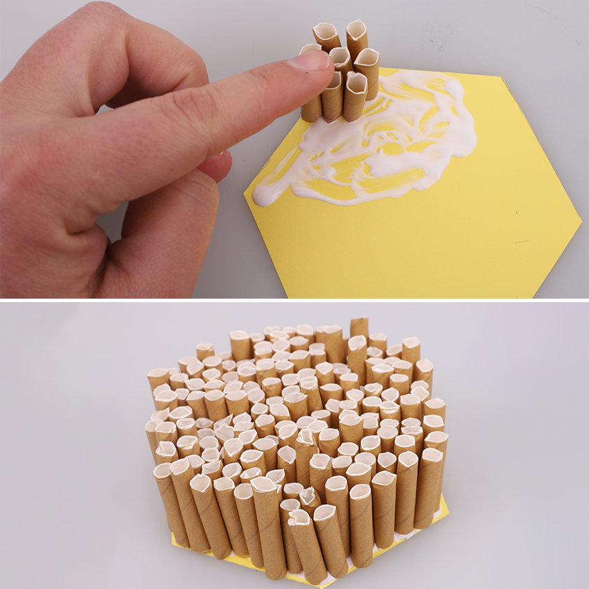 • Step 3Add some tacky glue to a section of the cardboard hexagon and begin to glue the straw pieces in place. Arrange them so they are right next to each other and standing straight up. Continue adding glue and filling the hexagon until it is completely covered. Allow to dry.