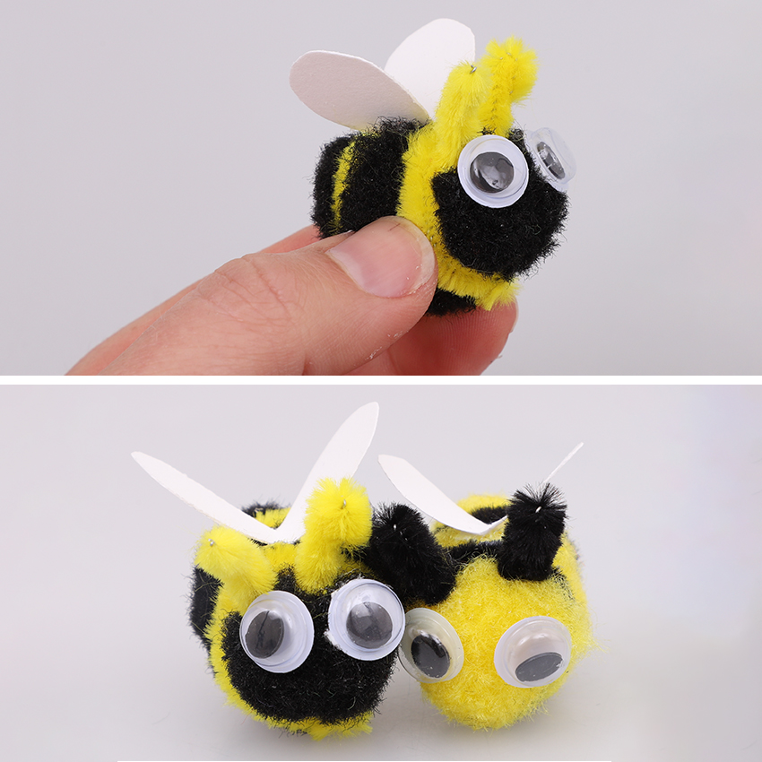 • Step 5Take a pom pom and wrap a chenille stem around it close to one end, twisting the chenille stem together at the bottom and trimming the excess. Repeat on the other end of the pom pom to create the bee’s stripes. Cut two short pieces of chenille stem and twist them onto the top part of one of the stripes to create the antennae. Use tacky glue to attach two wiggle eyes under the antennae. Cut a small set of wings from white cardboard and glue them onto the middle of the bee’s back. Allow to dry.