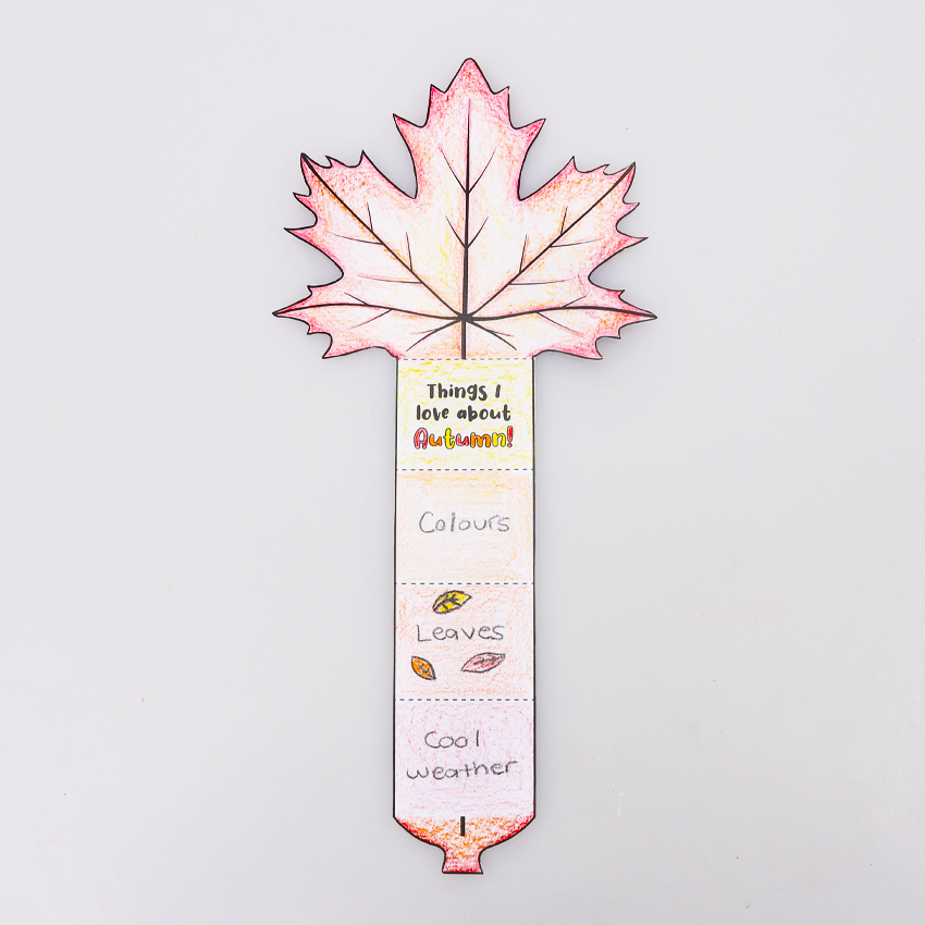 • Step 2Colour in your template with Autumn colours. Don’t forget to draw or write your favourite things about Autumn on the blank folds!