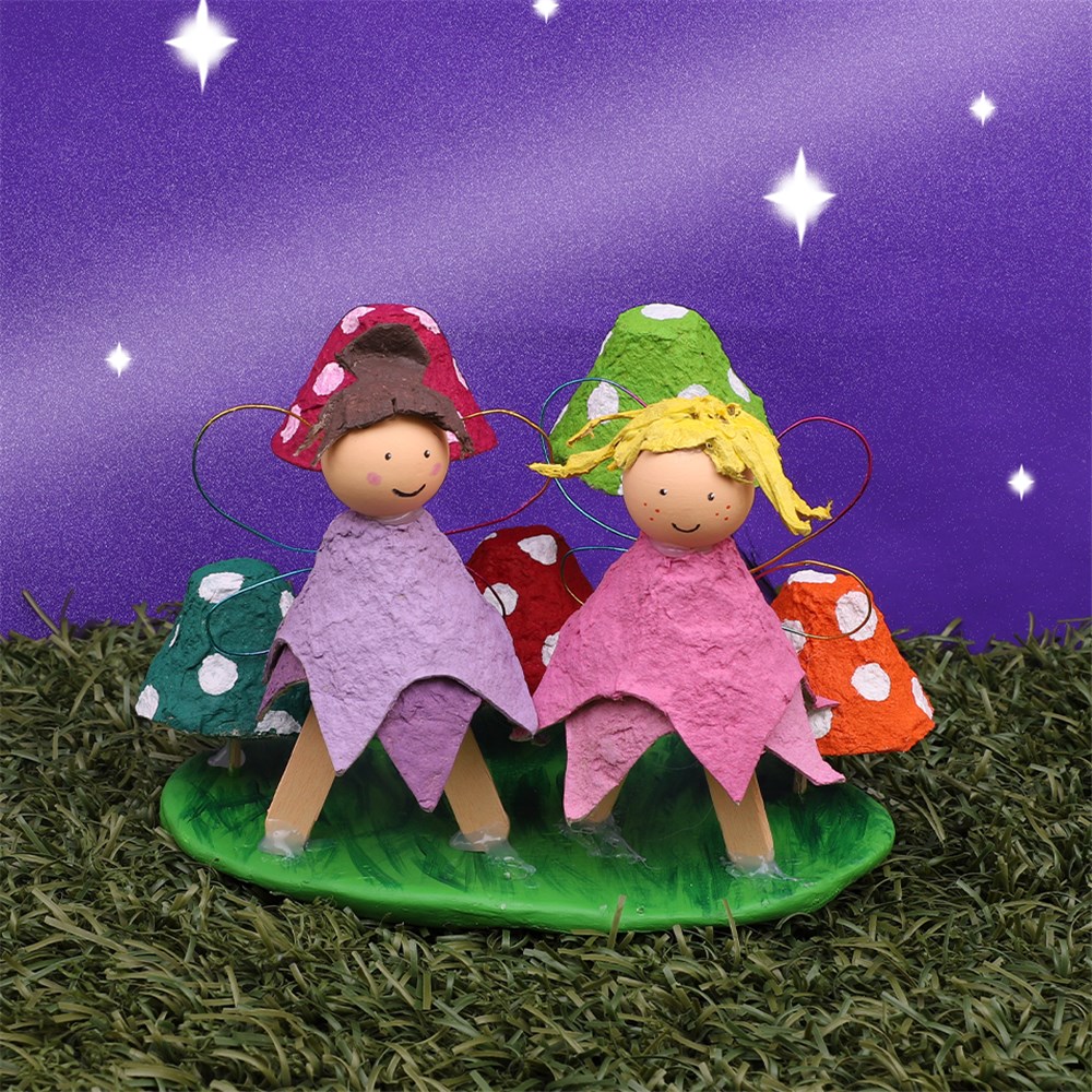 • Step 11Glue your fairies to the base to place them in your garden scene. Your Egg Carton Fairy Garden is now ready to display!