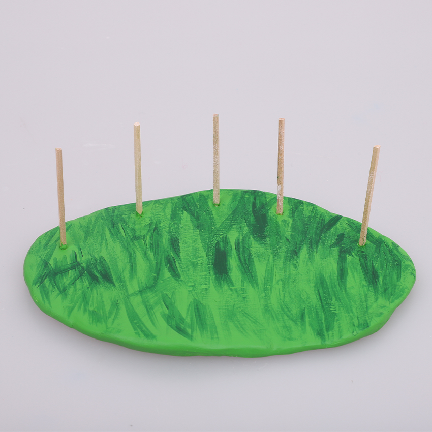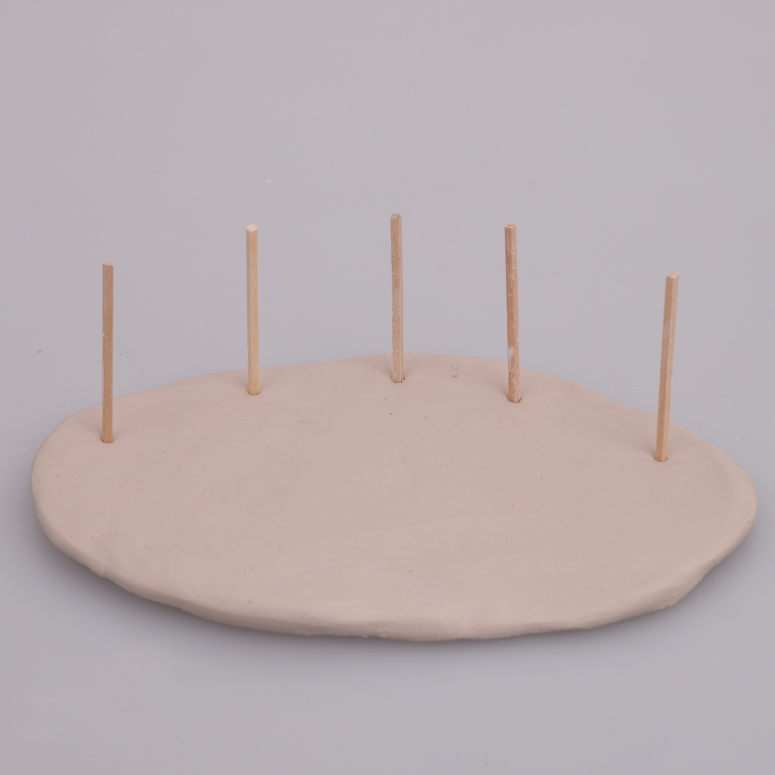• Step 1Roll 200 - 250g of clay into a flat oval to create a base. You may need more clay depending on the size you would like your base to be. Use a small amount of water on your finger to smooth out the surface. Insert five matchsticks into the clay as shown. If your base is larger you might like to add more matchsticks. These will become the stems for your mushrooms. Set the clay aside to dry for at least 24 hours.
