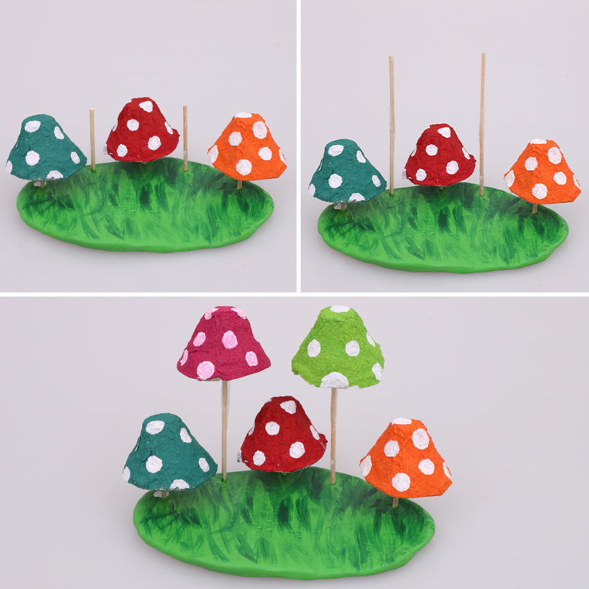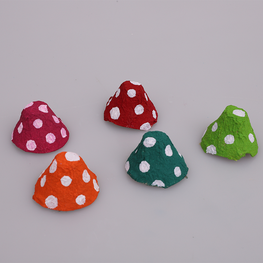 • Step 2Cut out the number of egg wells you need for your mushroom tops from an egg carton tray. Adult supervision is recommended when using scissors. Trim around the edges of each well so it looks neat. Keep the remaining tray and scrap pieces for later steps. Paint your mushroom tops with your choice of paint colours. Allow to dry. Paint small white circles onto your mushroom tops and allow to dry.