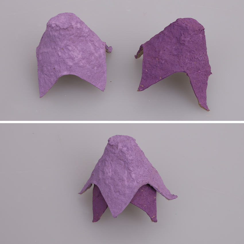 • Step 4Cut another two wells from your egg carton and trim them so they have four points as shown. Keep the remaining tray and scrap pieces for a later step. Paint each well with your choice of colours and allow to dry. Insert one egg well into the other and secure using a glue gun. Adult supervision is recommended when using a glue gun. Allow to dry. This will form the body of your fairy.
