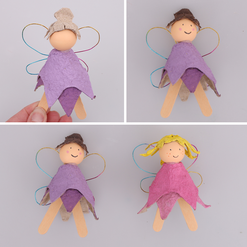 • Step 8Use the scrap pieces you set aside in steps 2 and 4 to create strands of hair and glue to the top of your wooden bead. Allow to dry. Paint the hair with your choice of colour and allow to dry. Paint eyes and a mouth to your fairy’s face. You can also add details like freckles and rosy cheeks. Allow to dry. Repeat steps 3-8 to create more fairies if you wish.