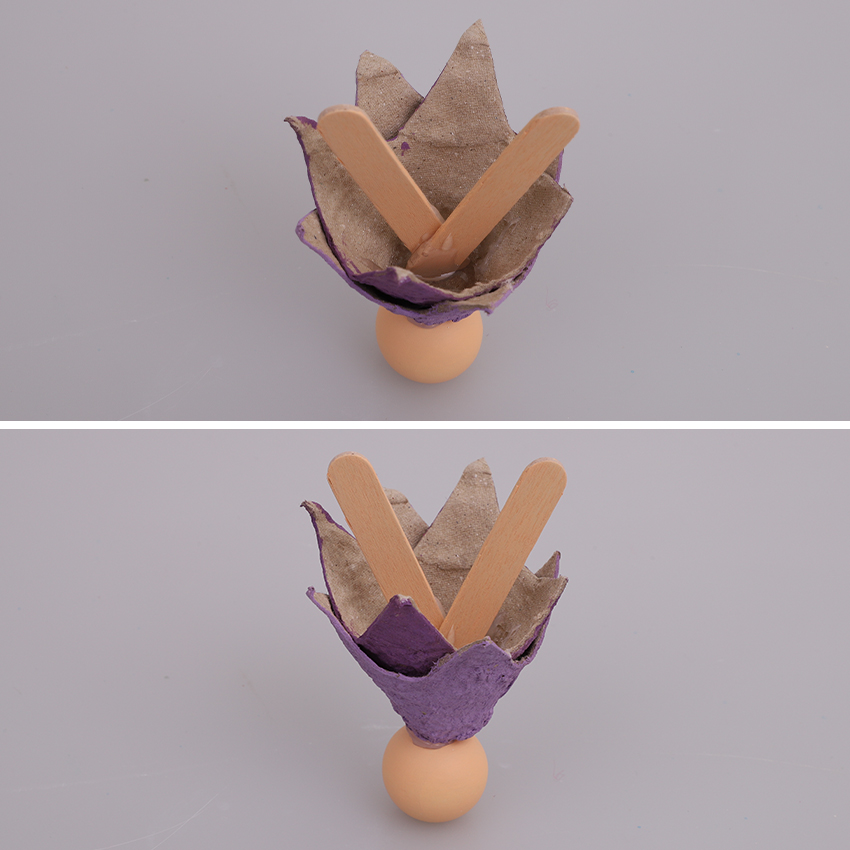 • Step 5Glue the wooden bead to the top point of the egg wells, making sure the hole of the bead is at the top. Allow to dry. Turn the bead and egg wells over and apply a generous amount of glue into the well. Overlap one end of the mini popsticks as shown and place into the glue. Apply more glue if needed and hold the popsticks in place until the glue starts to dry. Allow to dry completely.