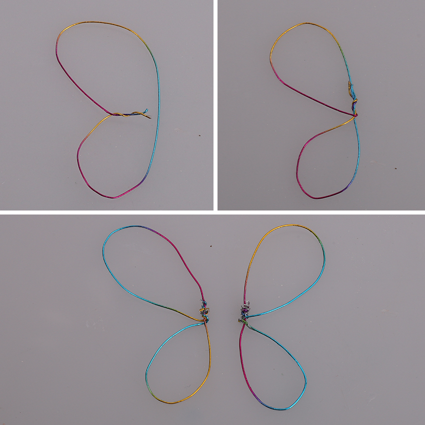 • Step 6Cut one piece of rainbow florist wire in half. Bend both ends of one half towards the centre to create two loops. Make one loop slightly bigger than the other to make wing shapes. Twist the ends of the wire together then twist around the middle of the loop to secure. Repeat for the other wire half. Bend and position the wings so they look similar.