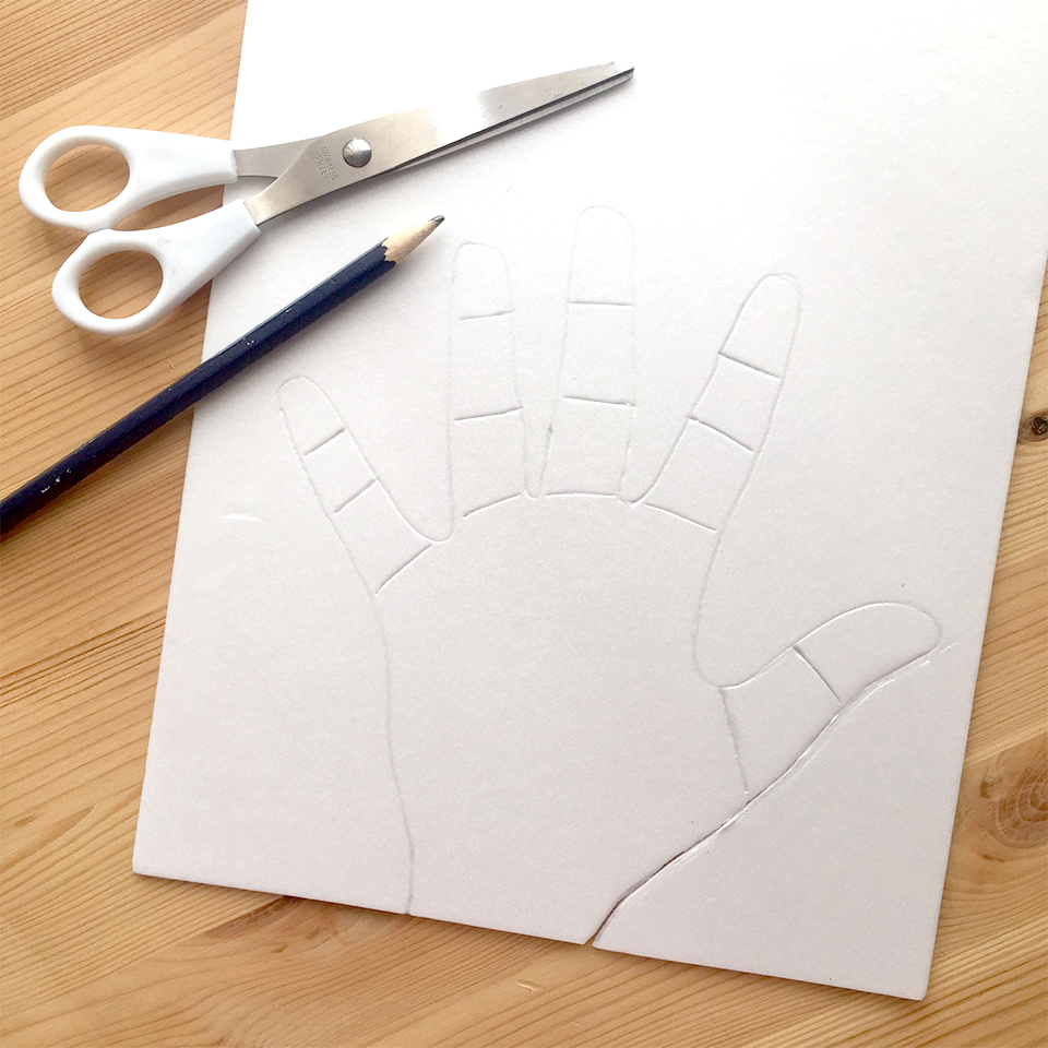 • Step 2 Use scissors to cut out your hand and then cut along the lines you created to show the knuckles. Be careful to keep your pieces in order so you know which bits belong where. You may even wish to number your pieces before cutting them out.