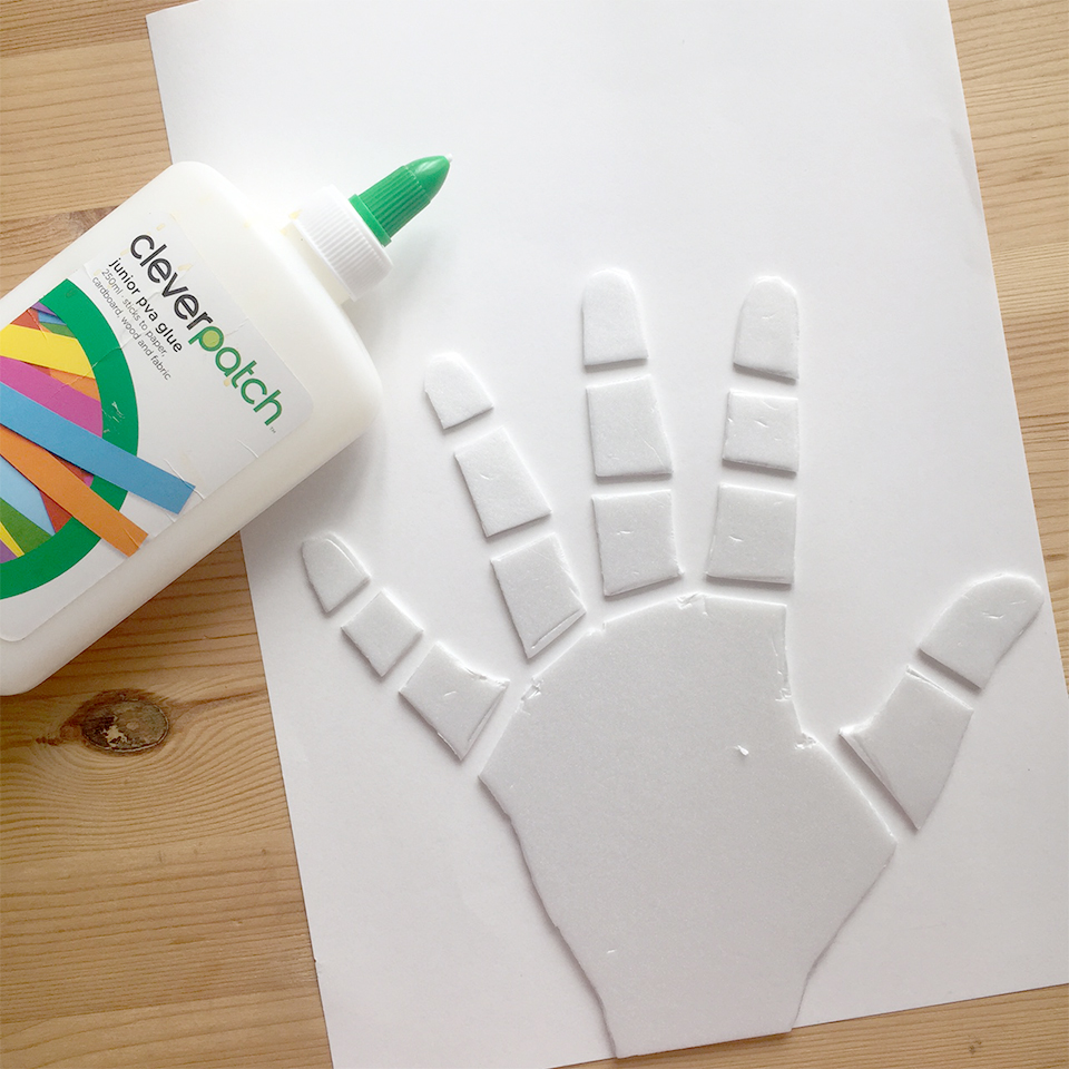 • Step 3 Glue the pieces of your hand in position onto the cover paper. Be sure to leave a gap between the pieces as this will ensure the fingers will be able to bend.