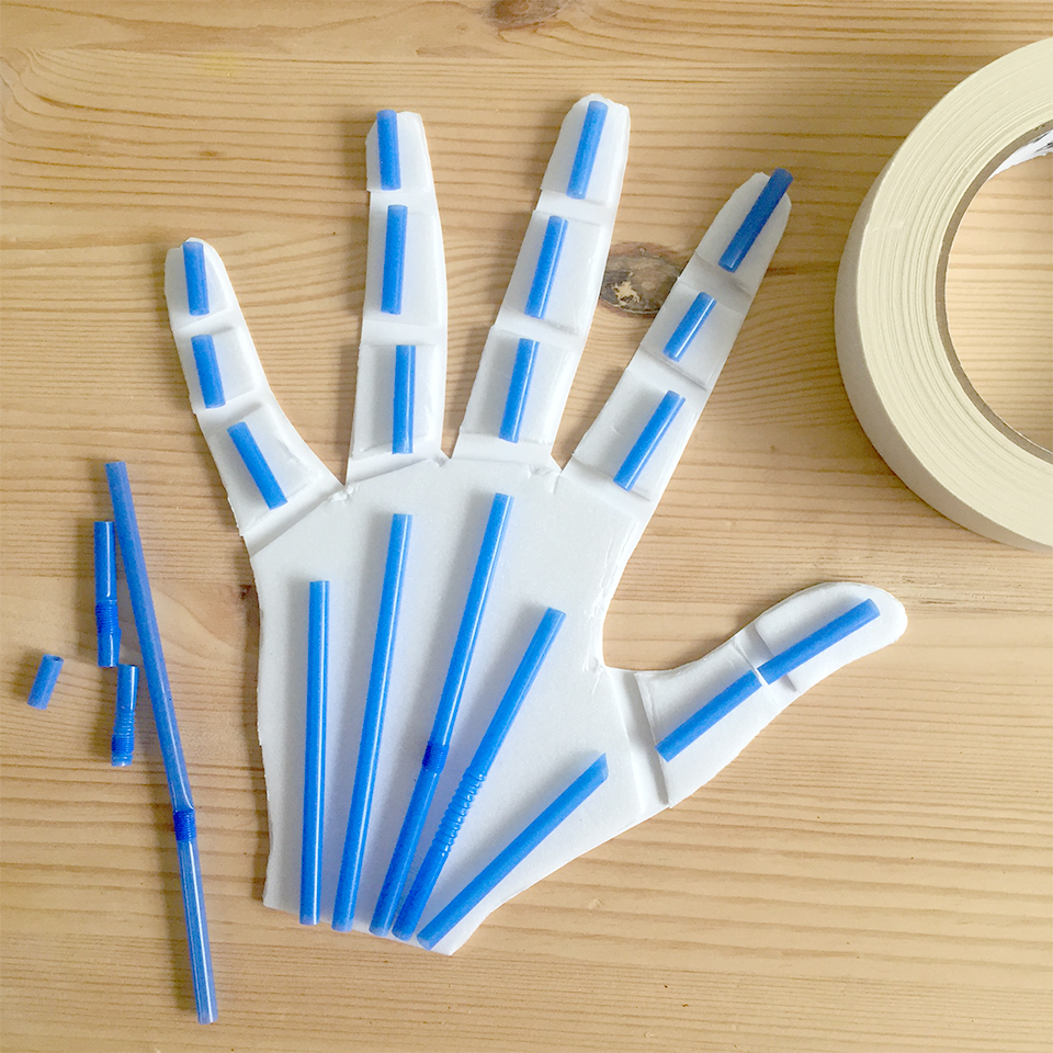• Step 4 Cut small pieces of straw to fit on each of the finger pieces plus 5 long lengths of straw to run down the palm of the hand.