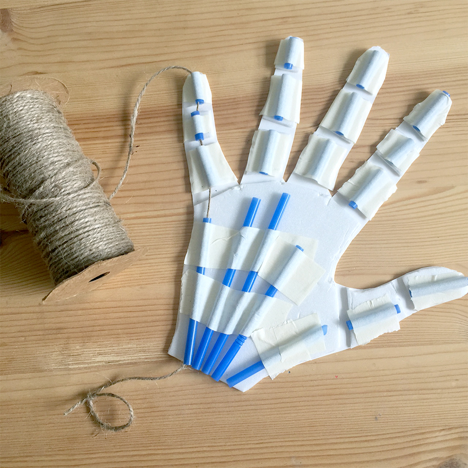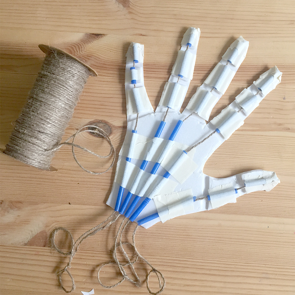 • Step 6 Thread the end of the twine down through the straws of the first finger so there is approximately 10cm hanging out the end so you can tie a loop. Cut the twine at the top of the fingertip and secure to the end of the fingertip with masking tape. Repeat this step for the remaining fingers and thumb.