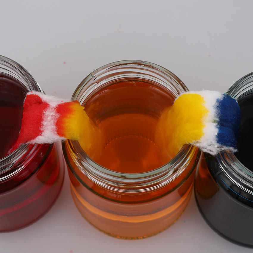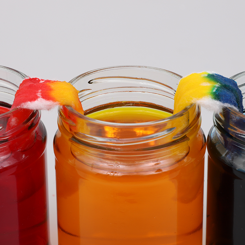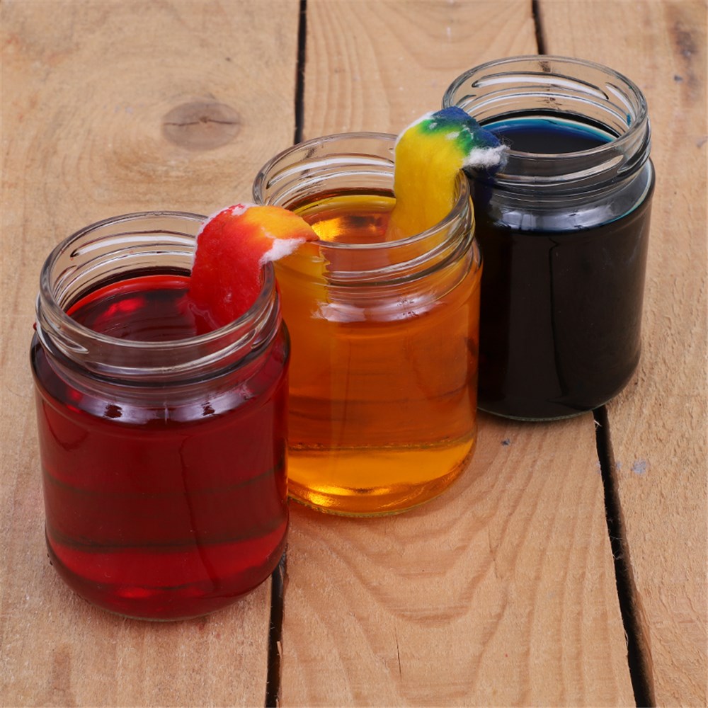 • Step 1Take 3 jars and add some powdered dye into each jar so you have a red jar, yellow jar and a blue jar. Top up each jar with water so it is close to the top but below the rim – you don’t want the jars to overflow! Mix with a spoon so the dye dissolves into the water.