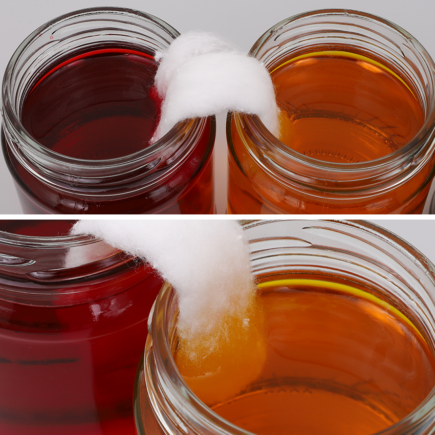 • Step 3Place the jars in a row so they are sitting close together. Take a cotton ball strip and place it half in the first jar and half in the second. You will see the colour begin to creep up the cotton ball!