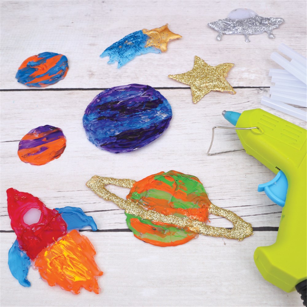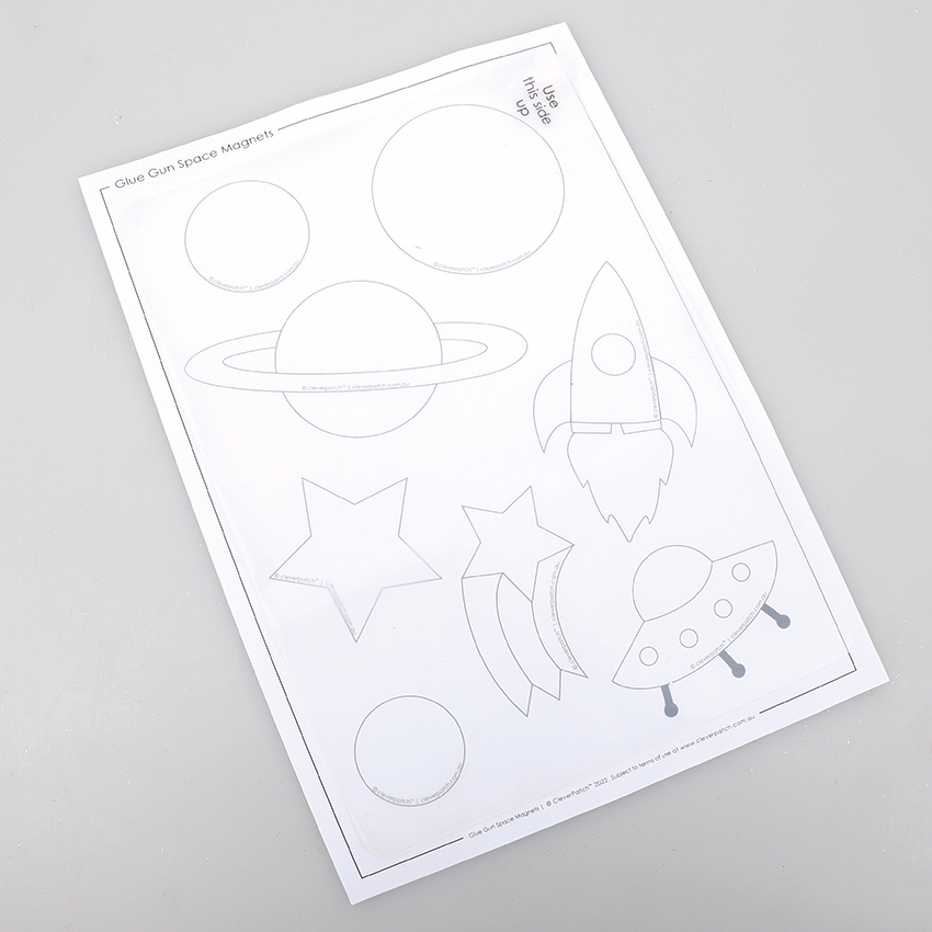 Get STUCK into some out of this world craft with these Glue Gun Space Magnets! Use the templates provided or create your own fun designs. These magnets are a great activity to help celebrate World Space Week!