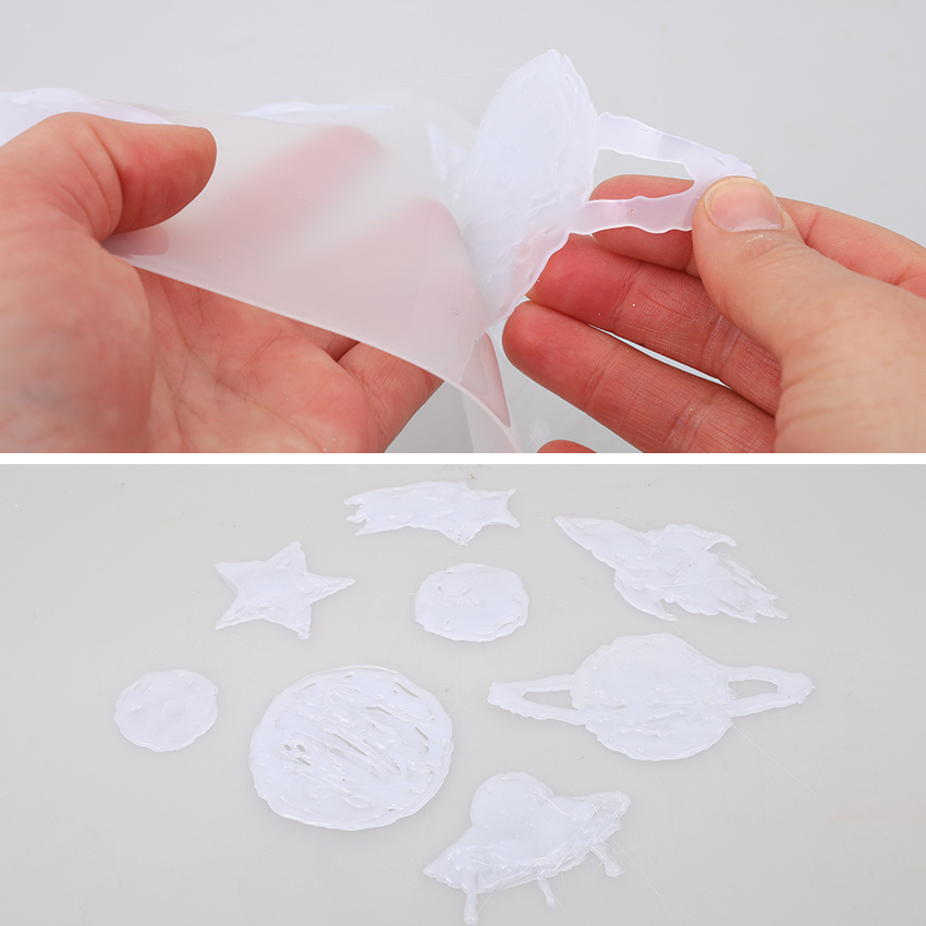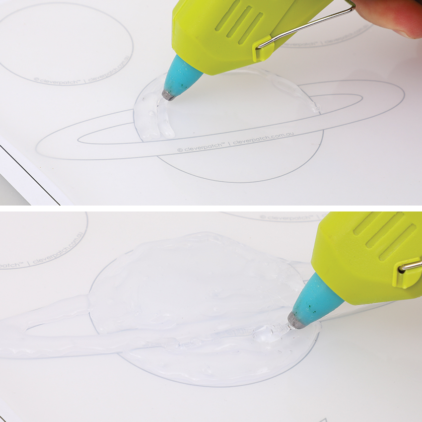 • Step 3As your designs dry, you may notice some gaps in your designs. Sometimes these add to the look of the design itself (like the surface of the planets!), but you can fill any large gaps with more glue as needed. Once you are happy with your designs, allow the glue to dry then carefully peel the shapes off the heat resistant mat.