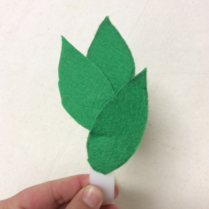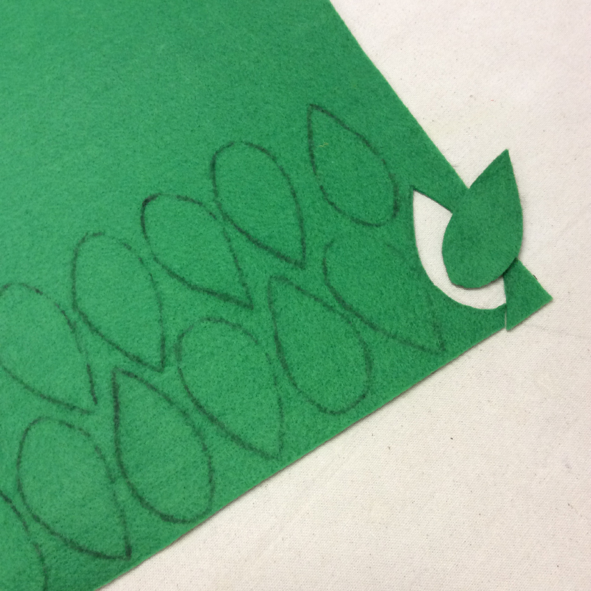 • Step 1Use the template provided to trace and cut out several green felt leaves. We have used 18 leaves, however you may need more or less depending on how far apart you attach each leaf. Adult supervision is recommended when using scissors.