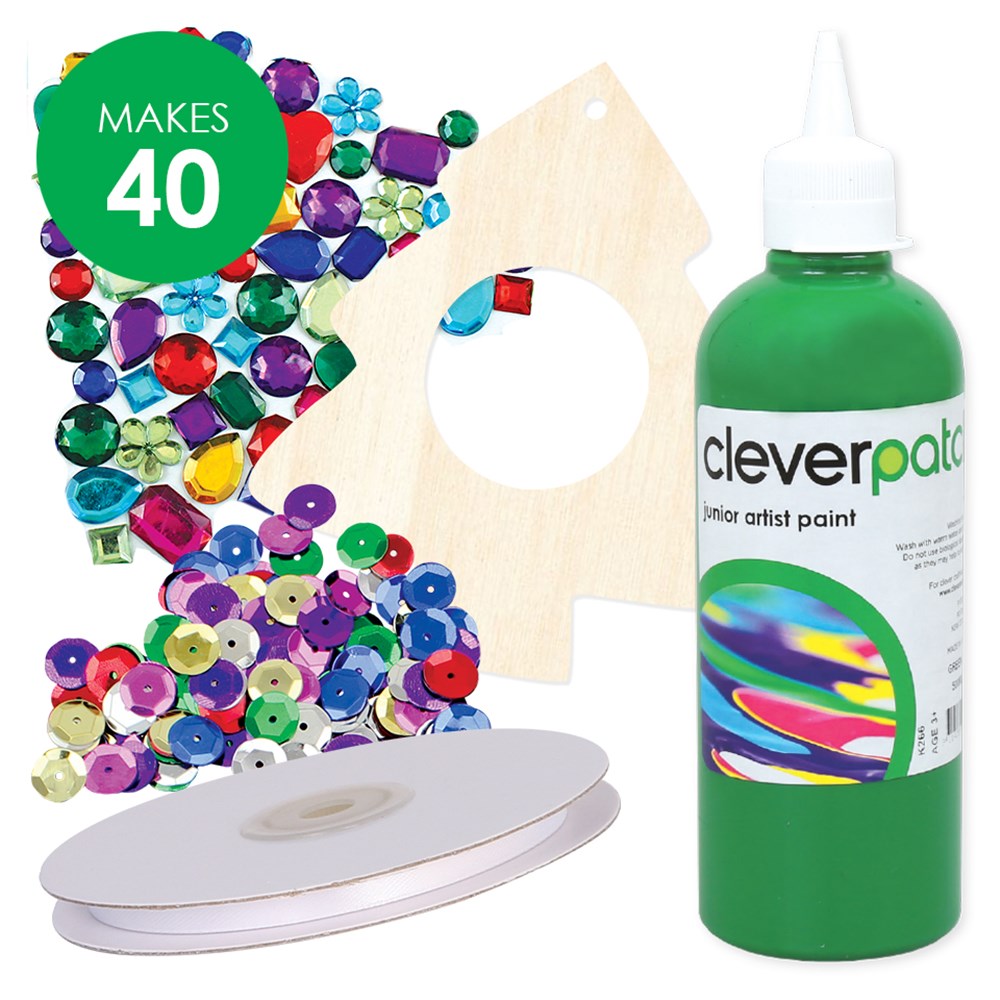 Group pack includes all components required to create and decorate 40 Christmas Tree Frames. Each wooden frame measures 10 x 12cm. Circle space for photo measures 4cm in diameter. PVA glue and paint brushes are required to complete this activity (sold separately). Contents may vary .