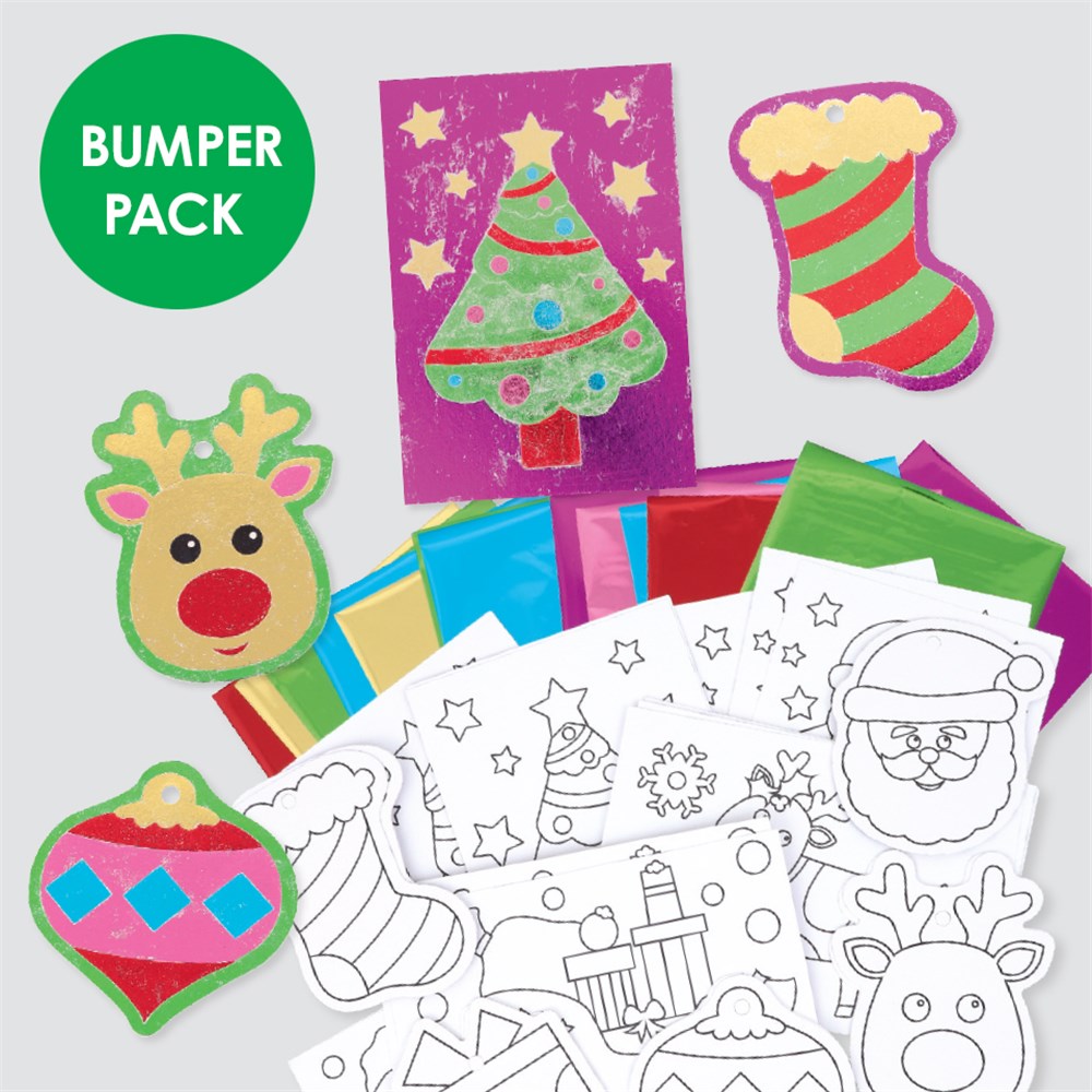 This pack includes components required to create 100 Christmas Foil Art masterpieces. Foil sheets are A5 size. Contents and colours may vary.