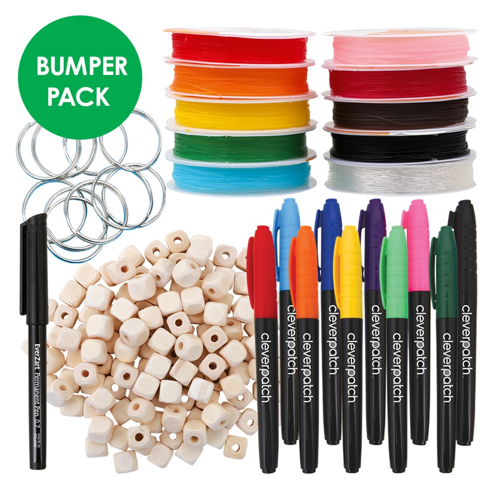 This bumper pack includes everything you need to create your own personalised Keyrings and/or Bracelets! Decorate the plain beads however you like (you can even write a word or message!) then use them to create your masterpieces.