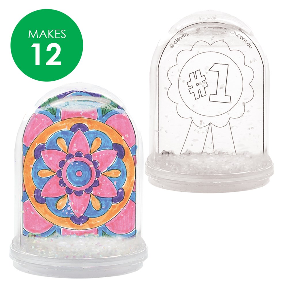 The pack includes components required to create 12 Snow Globes. Each template insert has two sides so the snow globe can be viewed from any angle! Simply colour, cut and fold your template before placing into your filled Snow Globe.