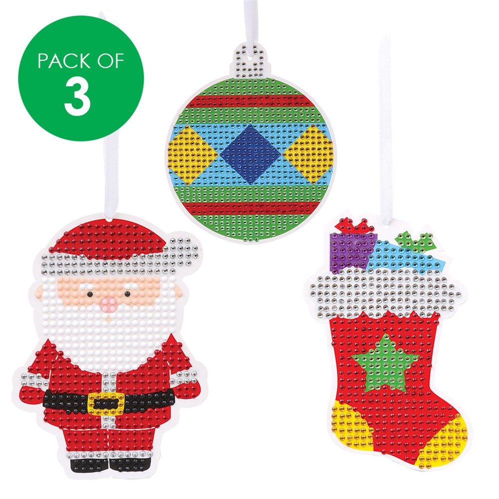 Pack includes all components required to create and decorate 3 Christmas Gem Art Ornaments. 3 different designs. Each ornaments pieces are individually packed for easy distribution and use. Santa measures 10 x 13.8cm (excluding hanger) when assembled. Colours may vary.