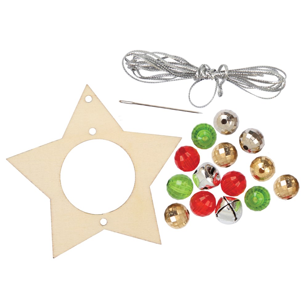 Materials make one Wooden Star Ornament. Beads measure 1cm in diameter. Measures approximately 24cm long when assembled. Scissors are required to complete this activity (sold separately). Colours may vary. Before construction, your wooden star shape can also be painted or decorated to create a more colourful ornament!
