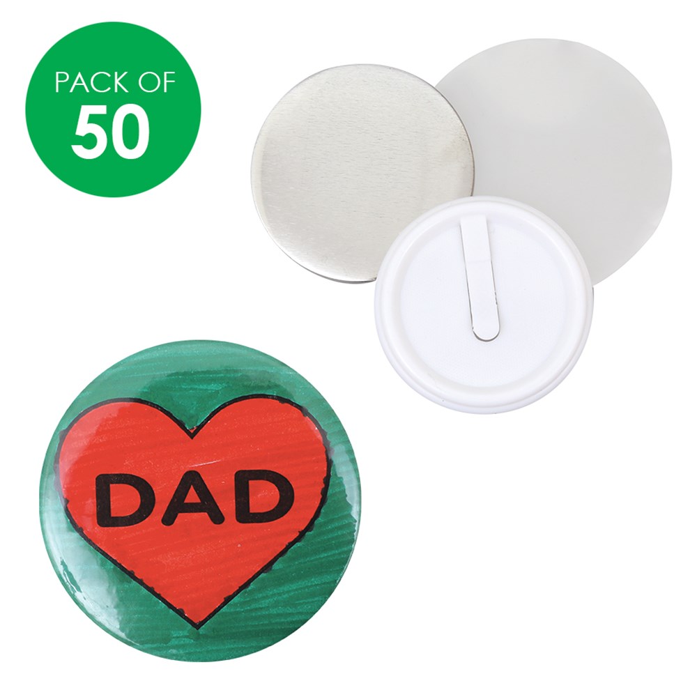 Requires our Badge Making Machine & Circle Cutter (sold separately). Includes components to create 50 badges measuring 58mm in diameter. Includes metal tops, protective films and plastic badge backings with safety clips. Plain for you to create. Measures 5.8cm in diameter and 6mm wide when assembled.