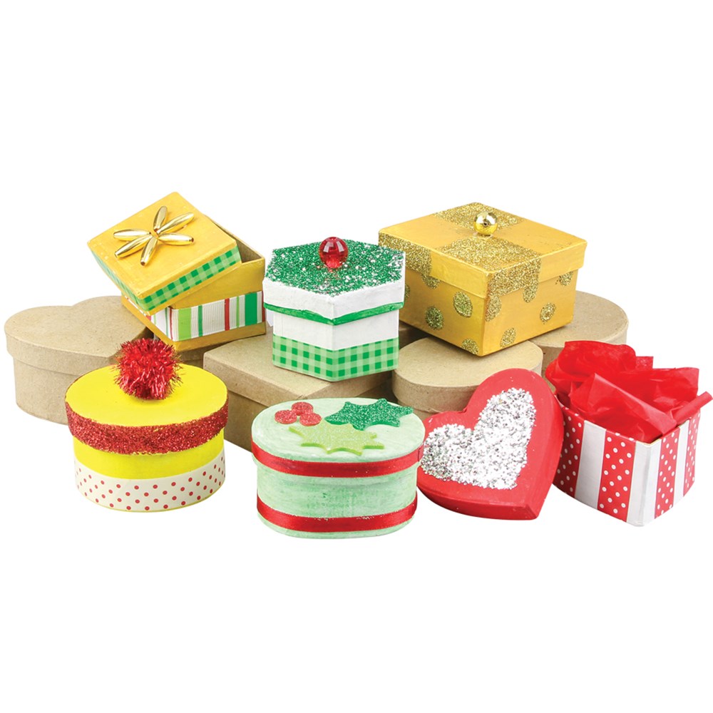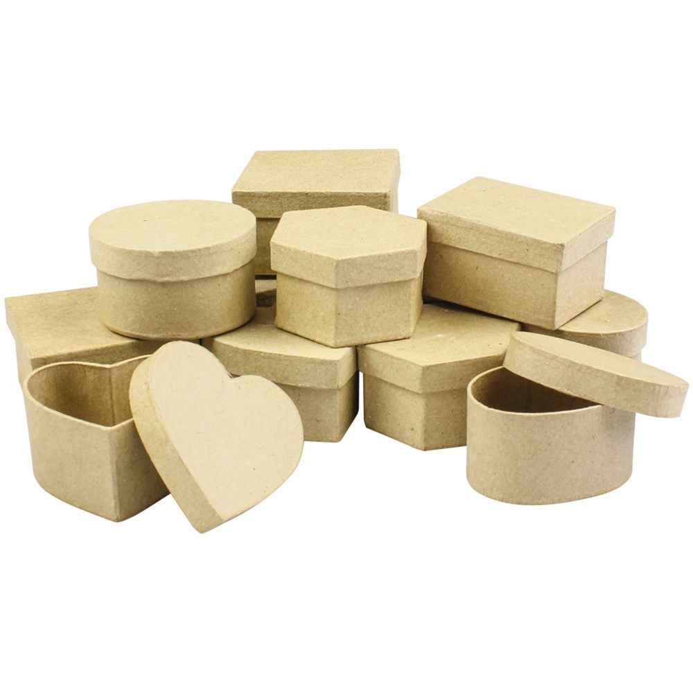 Includes 12 boxes in 6 assorted designs (square, rectangle, oval, heart, hexagon and circle). Plain for you to create. Handmade. Circle box measures approximately 6.5 x 4cm.