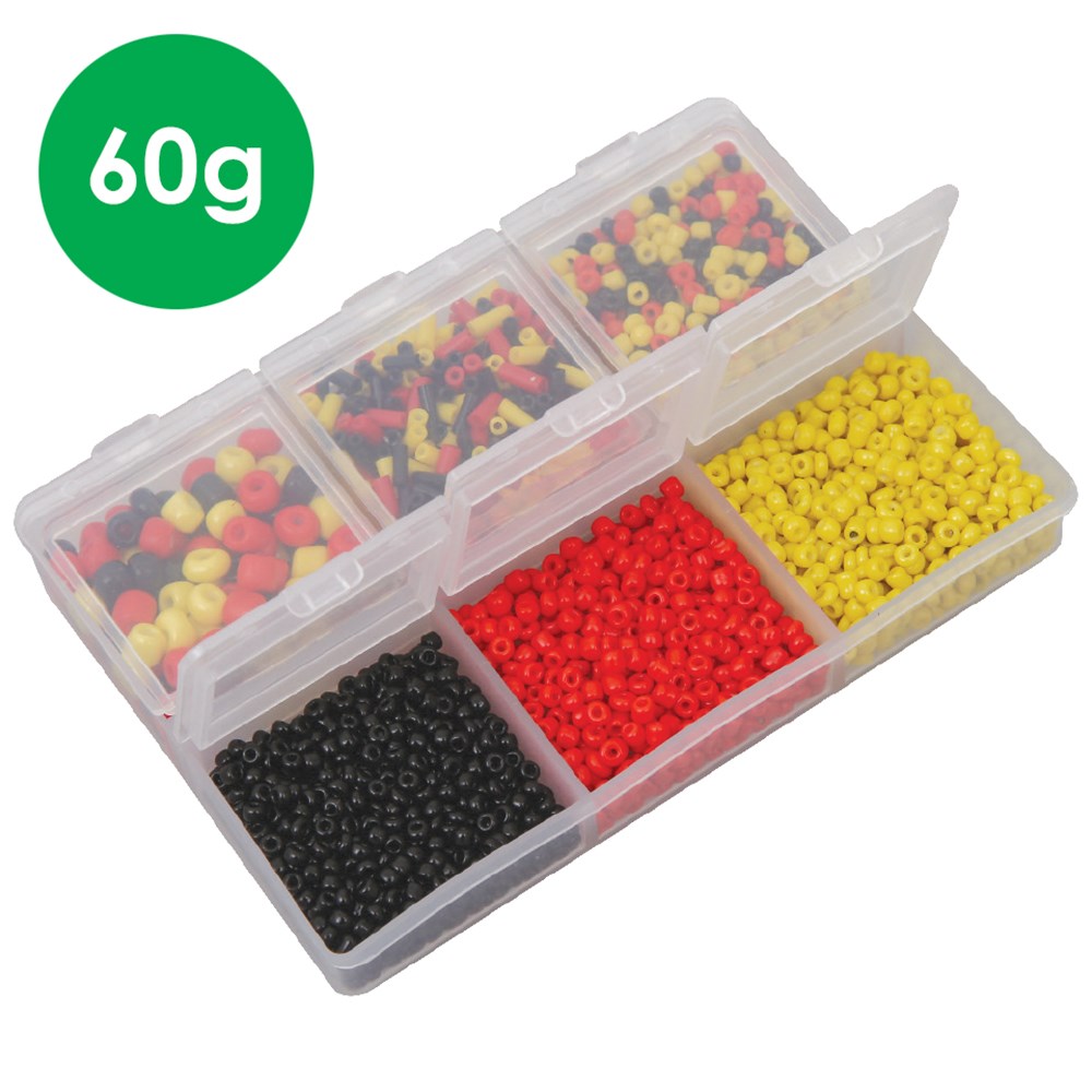 Approximately 1,400 small glass beads in assorted shapes, sizes and Indigenous inspired colours. Smallest bead measures 2mm in diameter. Largest bead measures 4mm in diameter. Storage case with compartments included. Beads may vary.