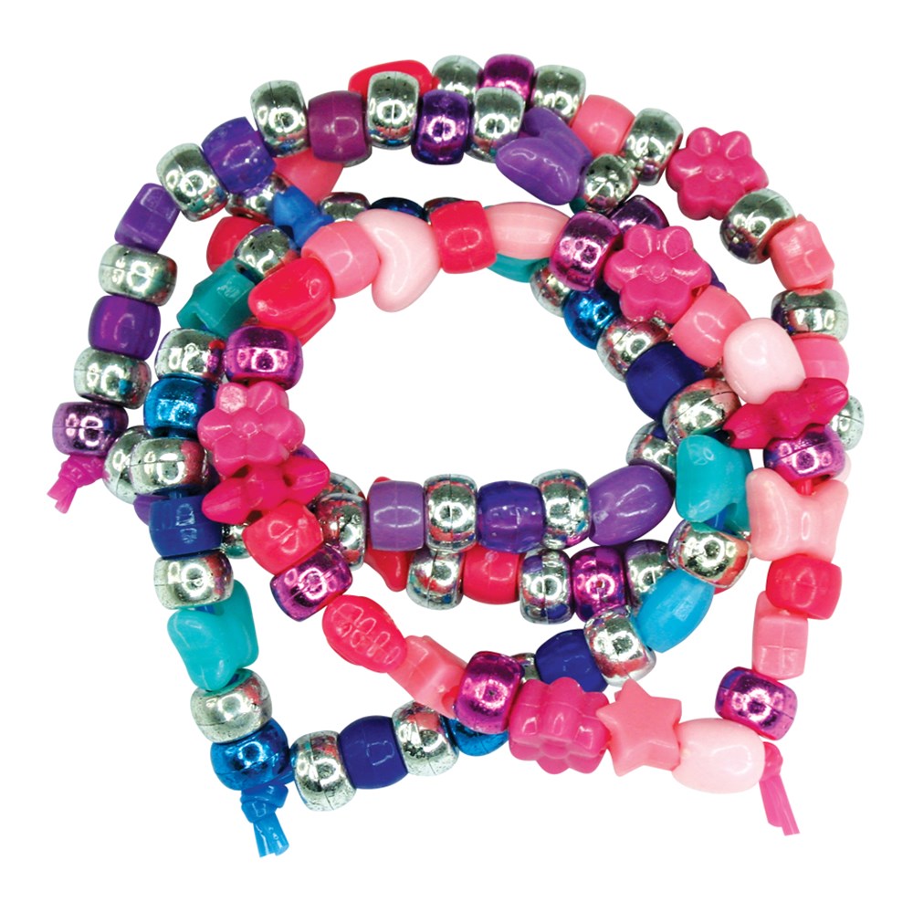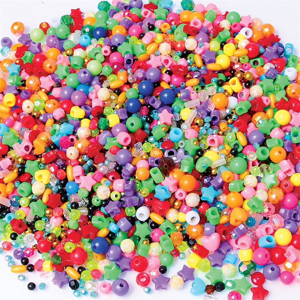 Bumper Bead Pack includes approximately 3,500 beads in assorted designs, sizes and colours. Largest bead measures approximately 1cm in diameter. Handy plastic storage tub included. Designs may vary.
