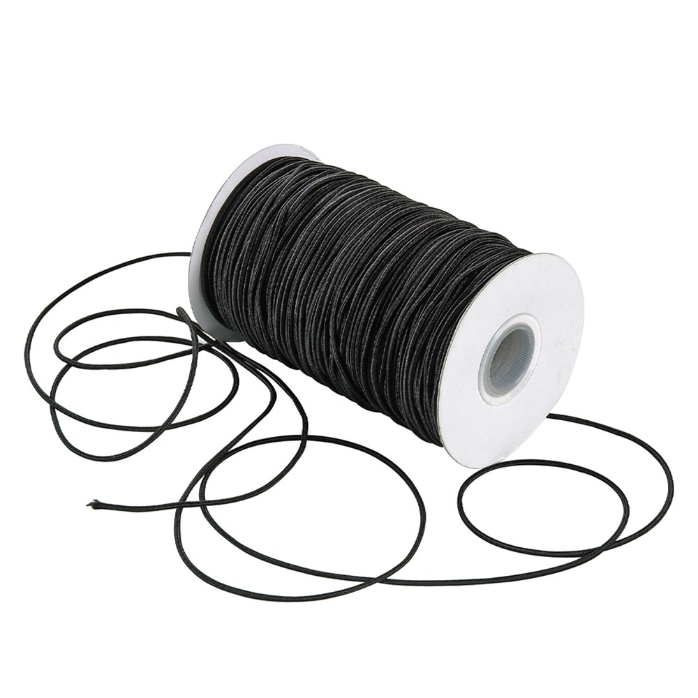 Thin, black elastic ideal for a variety of uses such as hanging decorations, displays, gift wrapping and masks.