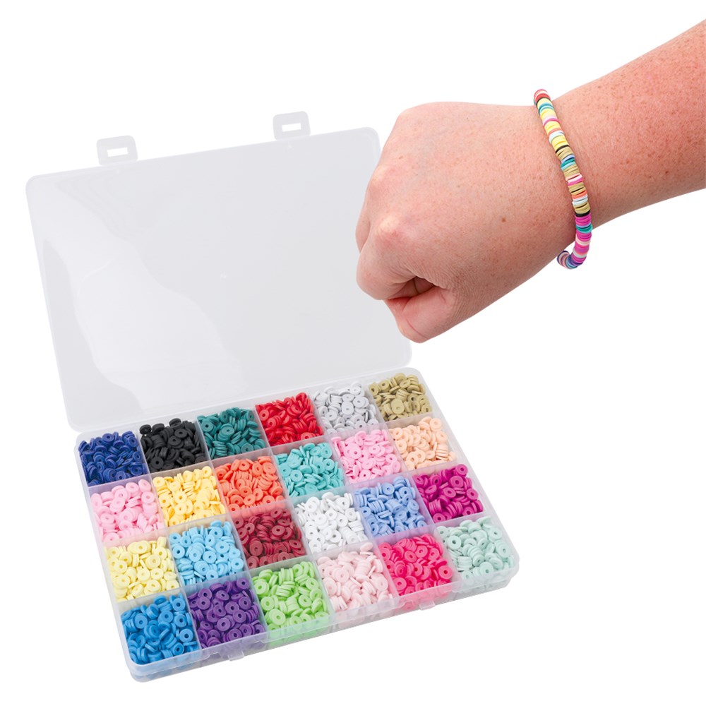 Our Heishi Bead Box contains approximately 5,800 clay beads in 24 assorted colours. Each bead measures 6mm in diameter and is 1mm thick. Partitioned storage case included. Bead sizes and colours may vary.