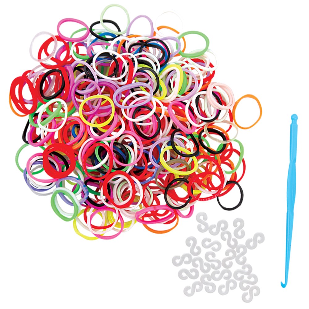 Kit includes 300 loom bands in assorted colours, 20 's' connectors and 1 plastic hook. Loom Board sold separately. Bands measure approximately 1.5cm in diameter. Colours will vary.