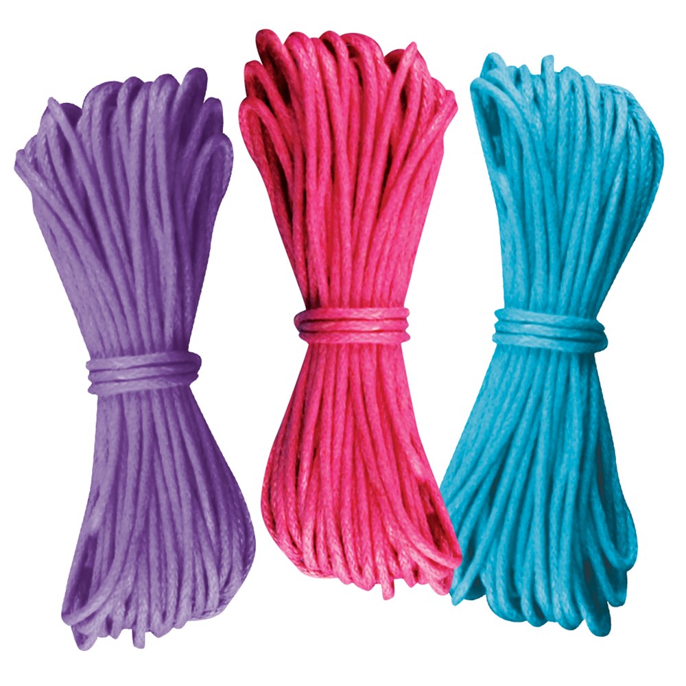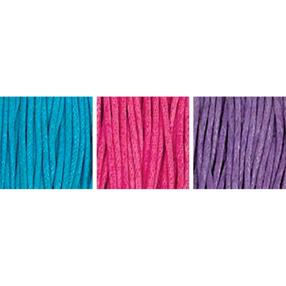 Bright waxed thread includes 3 rolls of assorted colours: 1 x turquoise, pink and purple. 5 metres of each colour (15 meters in total). Ideal for use in beading and jewellery making.