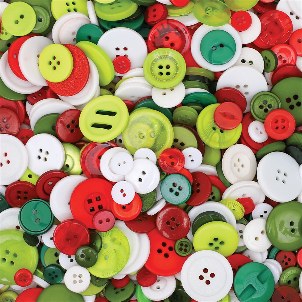 Over 500 plastic buttons in assorted sizes, shapes and Christmas colours. Largest button measures 2.5cm in diameter and smallest button measures 0.8cm in diameter. Size, colours and designs will vary.