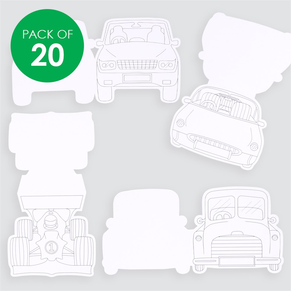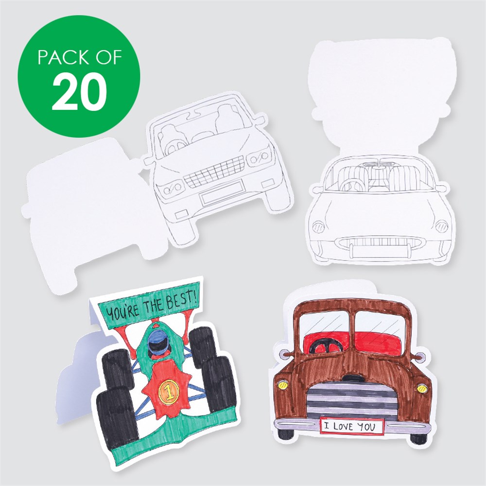Pack includes 4 assorted pre-printed designs, supplied plain for you to create using coloured markers and paint. Each card is made from 220gsm board. The largest card design measures 12.7 x 12.9cm when folded. Envelopes not included.