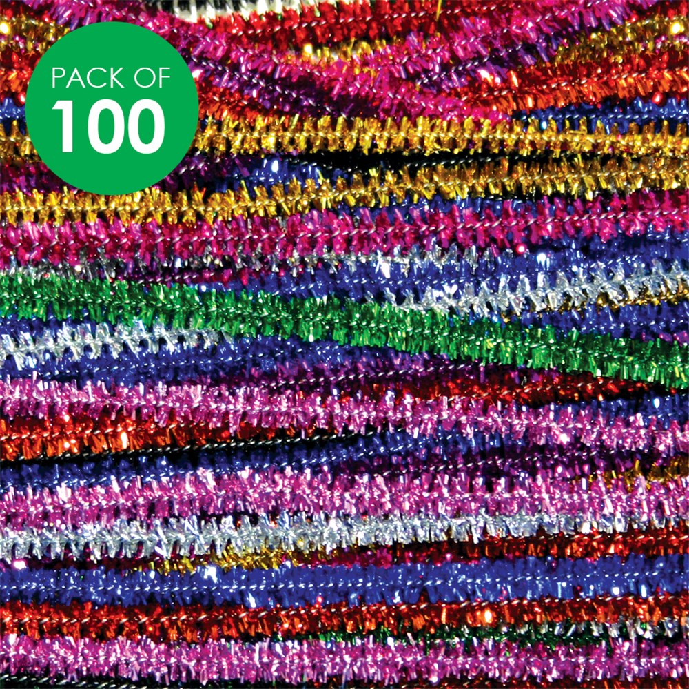 100 Tinsel Chenille Stems in assorted colours. Each chenille stem measures 0.5 x 30cm. Colours may vary.