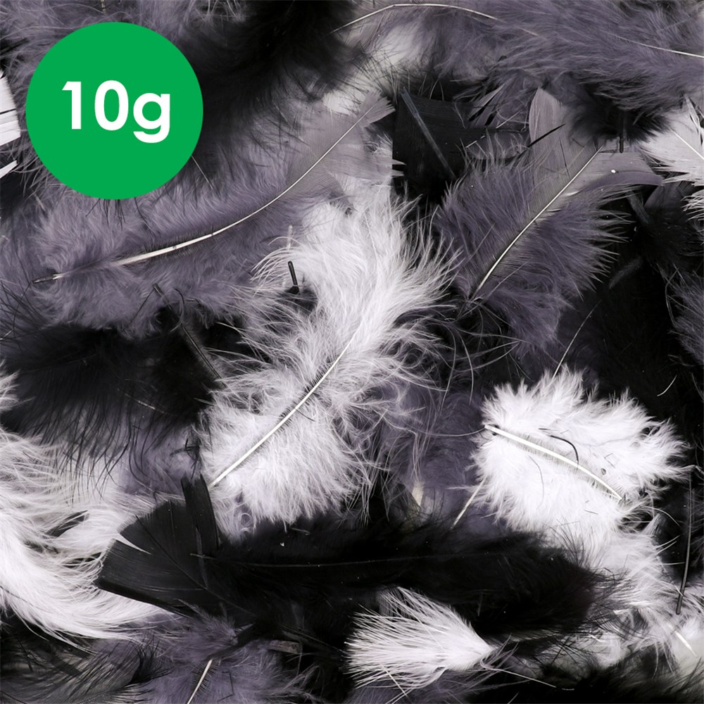 Each pack includes approximately 90 feathers in black, white and grey. Largest feather measures approximately 11cm long. Contents and sizes will vary.