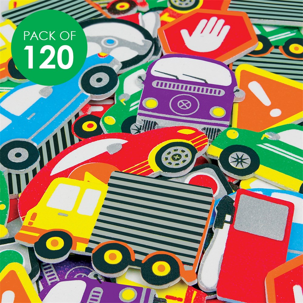 Self-adhesive foam car stickers in assorted sizes, colours and designs. Largest sticker measures 5.5 x 2.6cm.