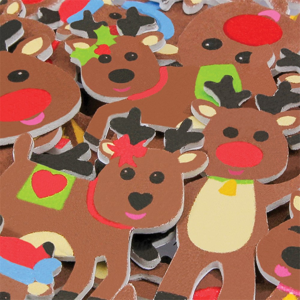 Self-adhesive reindeer foam stickers in assorted sizes, colours and designs. Largest sticker measures 5.2 x 3cm.