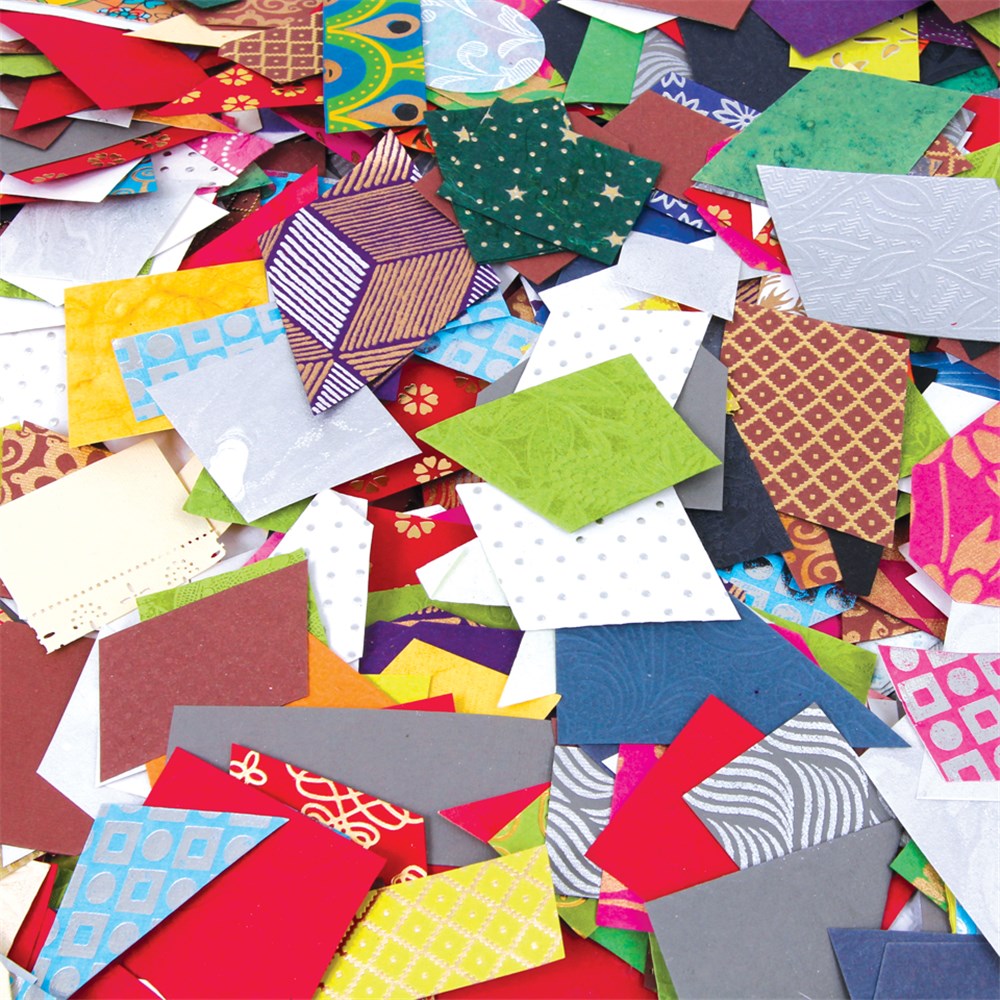 An assortment of pre-cut handmade paper shapes. Ideal for collage, card making or scrapbooking. Approximately 2,000 pieces. Largest shape measures 6.5 x 12.5cm. Colours, sizes and designs will vary.