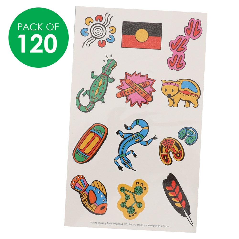 Pack of 120 temporary tattoos designed by Aboriginal Artist Belle Leonard, supplied on sheets (10 sheets per pack with 1 of each design per sheet). Temporary tattoos can be easily applied to skin, wood or porcelain using water.