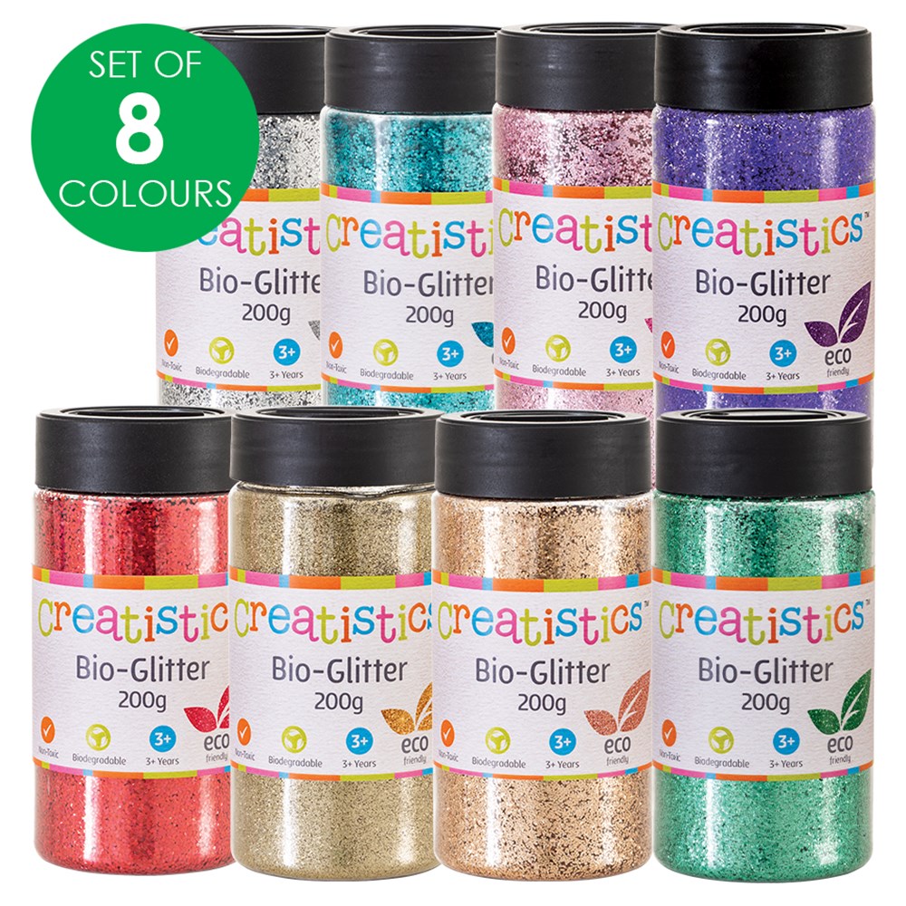 Supplied in handy easy pour shaker tubs. Set of 8 includes 1 of each colour (red, rose gold, gold, green, blue, pink, purple and silver). Non-toxic. Tubs may vary.