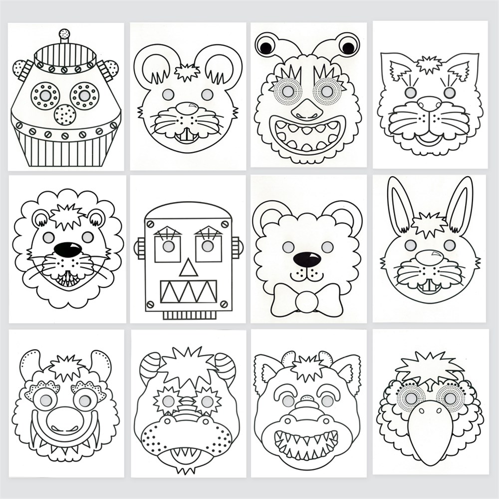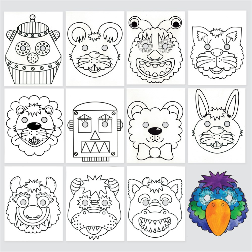 12 assorted mask designs printed on strong cardboard. Plain for you to create and colour-in. Provided in sheets with pre-cut eyes. Scissors are required to cut out masks. Elastic sold separately. Largest design measures approximately 21 x 26cm.