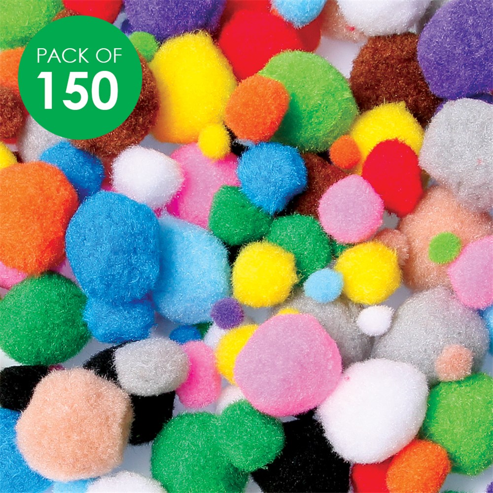 Pom poms in assorted sizes and colours. Largest pom pom measures 3.5cm in diameter. Colours may vary.