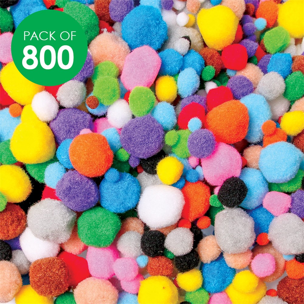 800 Pom Poms in assorted sizes and colours. Largest pom pom measures 3.5cm in diameter. Colours may vary.