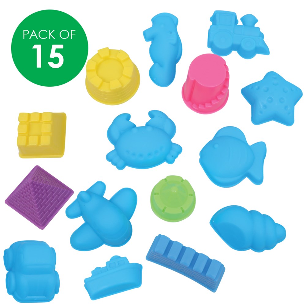 Plastic moulds perfect for use with sensory magic sand. 15 assorted shapes and designs included in a handy storage bucket. Largest measures 4.5 x 5.5 x 3.5cm. Sand sold separately.