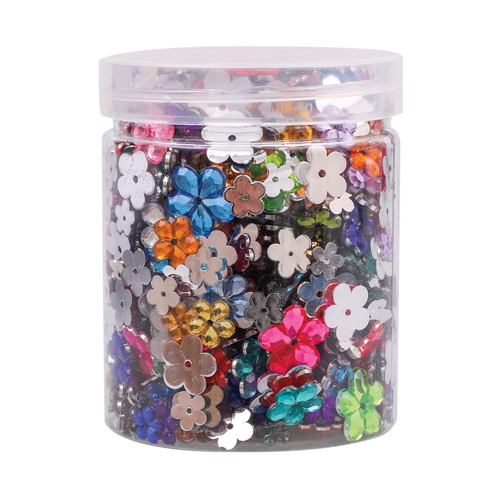 Assorted sizes and colours of Flower Rhinestones, perfect for adding a 3D touch to craft projects. Includes over 600 pieces per 100g pack. Storage tub included for easy and convenient storage. Largest rhinestone in the pack measures 1.5cm in diameter.