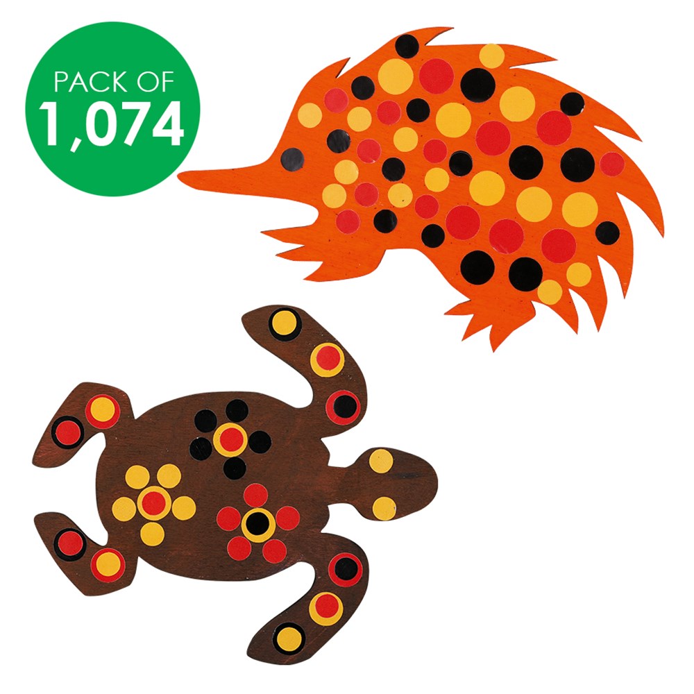 Each pack includes 2 assorted size circle stickers in 3 Indigenous colours. 6 sheets of stickers per pack (1,074 stickers total) with the largest sticker measuring 1cm in diameter and the smallest sticker measuring 0.7cm.