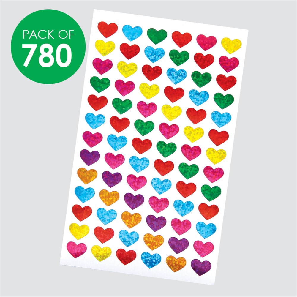 Assorted colours of Holographic Heart Stickers with 780 total stickers per pack. Includes 10 sheets of stickers. Stickers measure 1.2 x 1cm.
