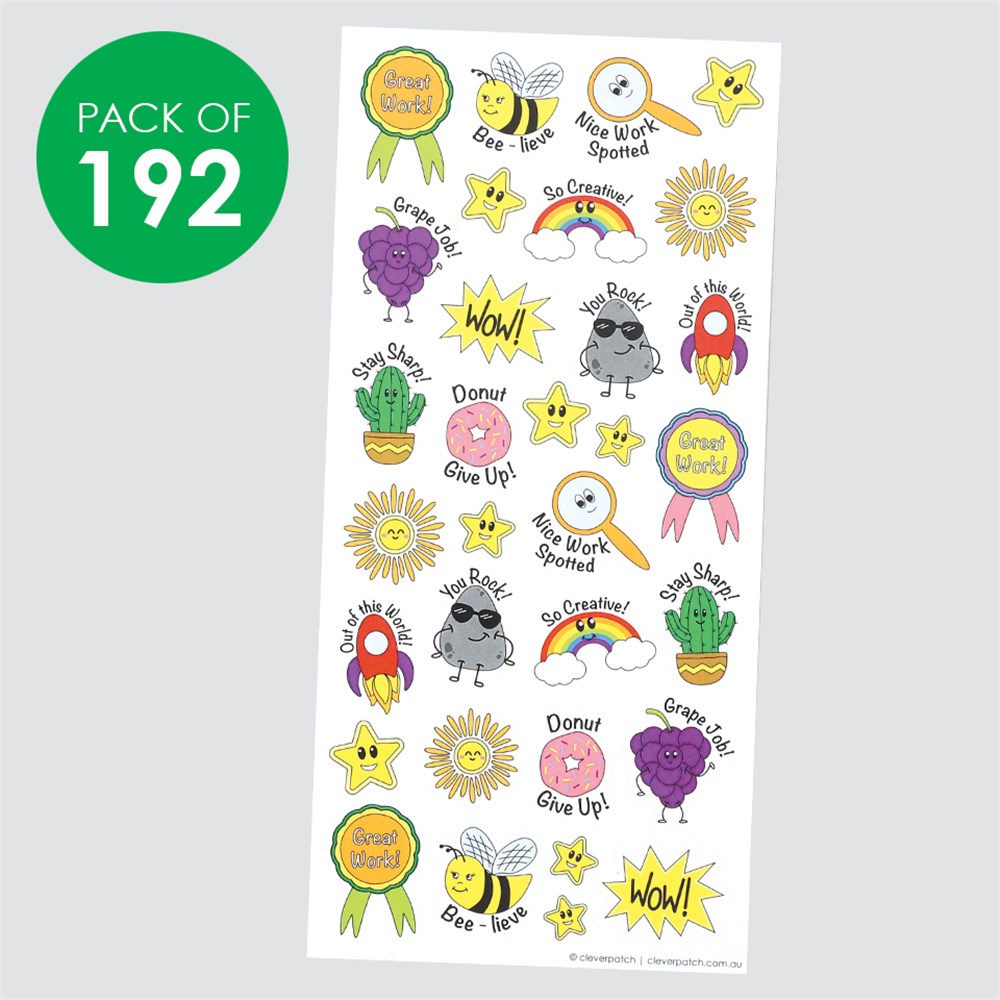 192 pack of assorted positivity sticker designs supplied on 6 sheets. Largest sticker measures 2.7 x 3.2cm.